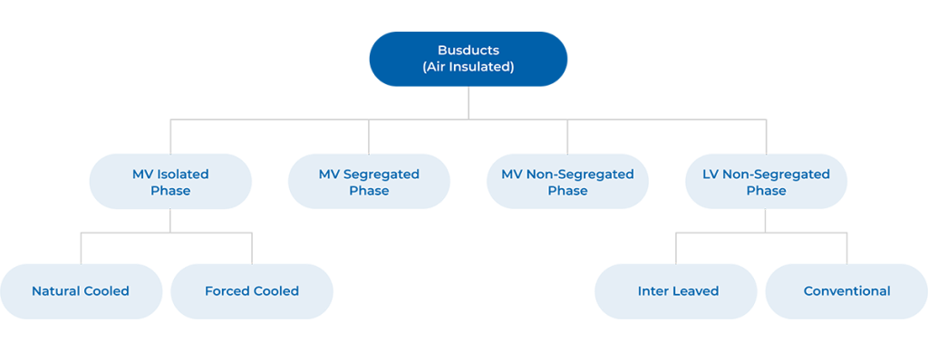 Broadly, the Air Insulated Busducts are classified into Isolated Phase Busduct, Segregated Phase Busduct and Non- Segregated Phase Busduct etc. as depicted in the following sketch and used in Low voltage / Medium voltage applications.